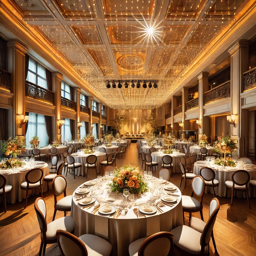 Runde Tische mit Stühlen herum. Perfekt bei festlichen Anlässen wie Hochzeiten oder Firmenfeiern.